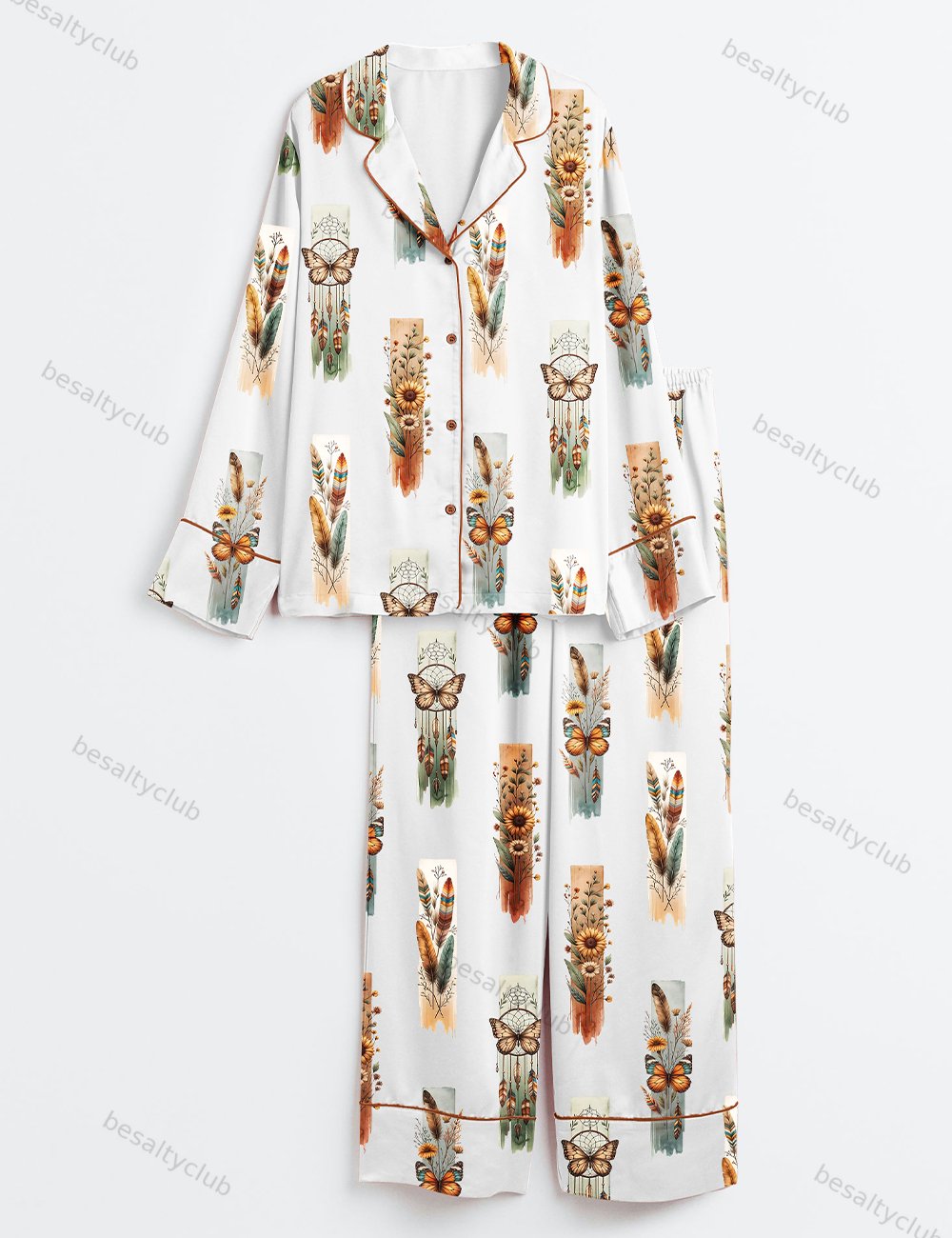 Boho Wildflowers Western Feathers Flowers Butterfly Floral Print Long Sleeve Satin Pajama Set