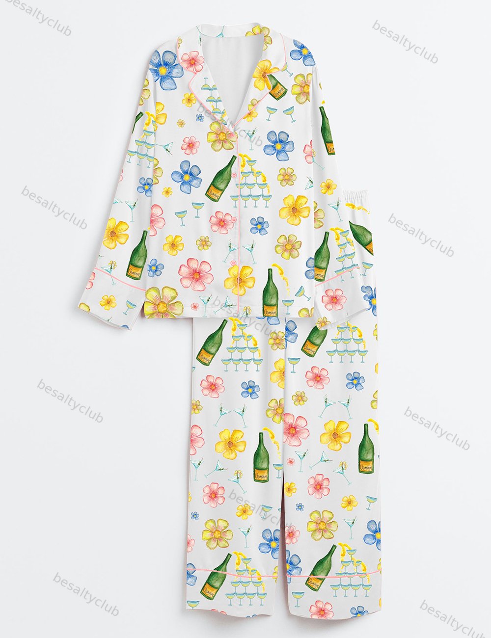 Champagne Martini Floral Long Sleeve Satin Pajama Set