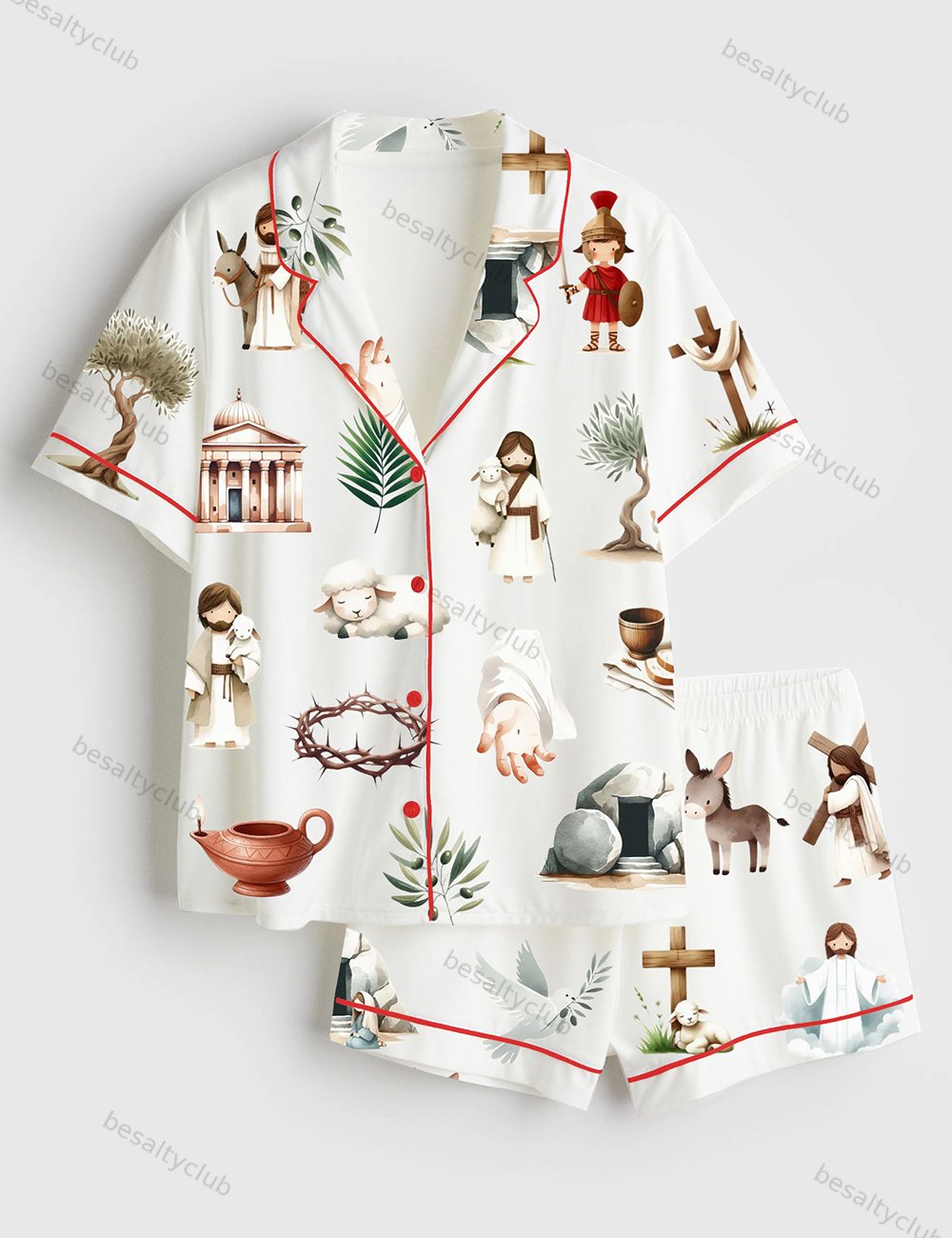 Holy Week Religious Easter Art Short Sleeve Satin Pajama Set