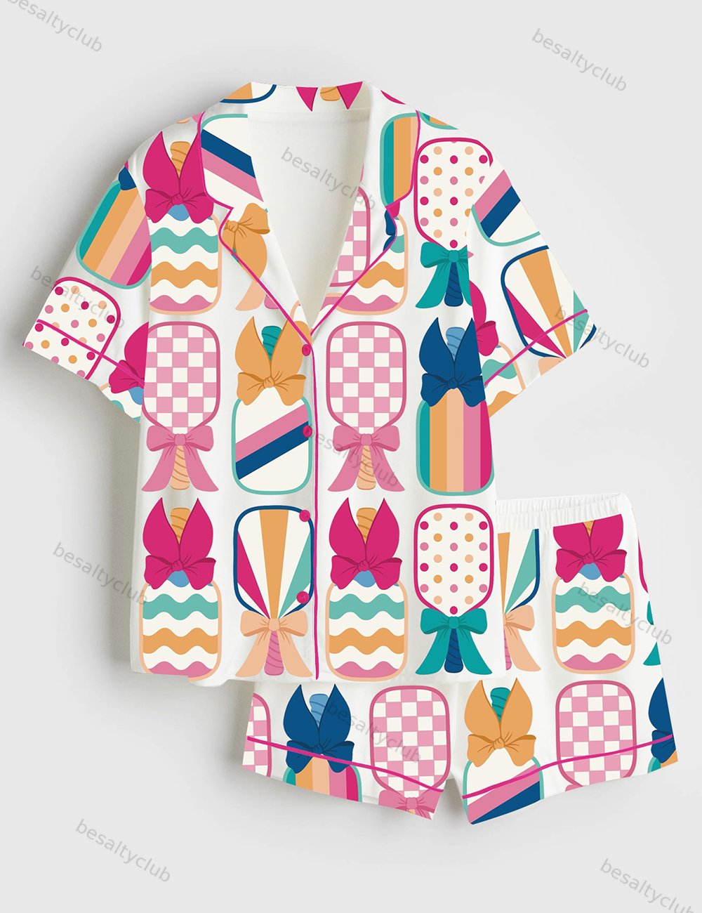 Preppy Pickle Paddle Pickleball Short Sleeve Satin Pajama Set