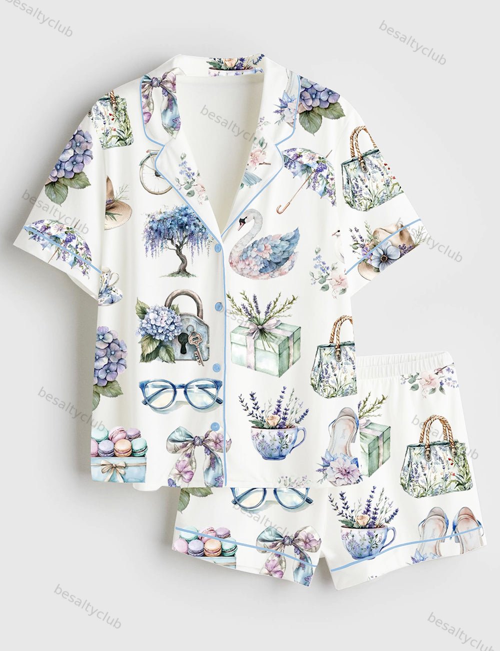 Floral Garden Spring Pattern Short Sleeve Satin Pajama Set